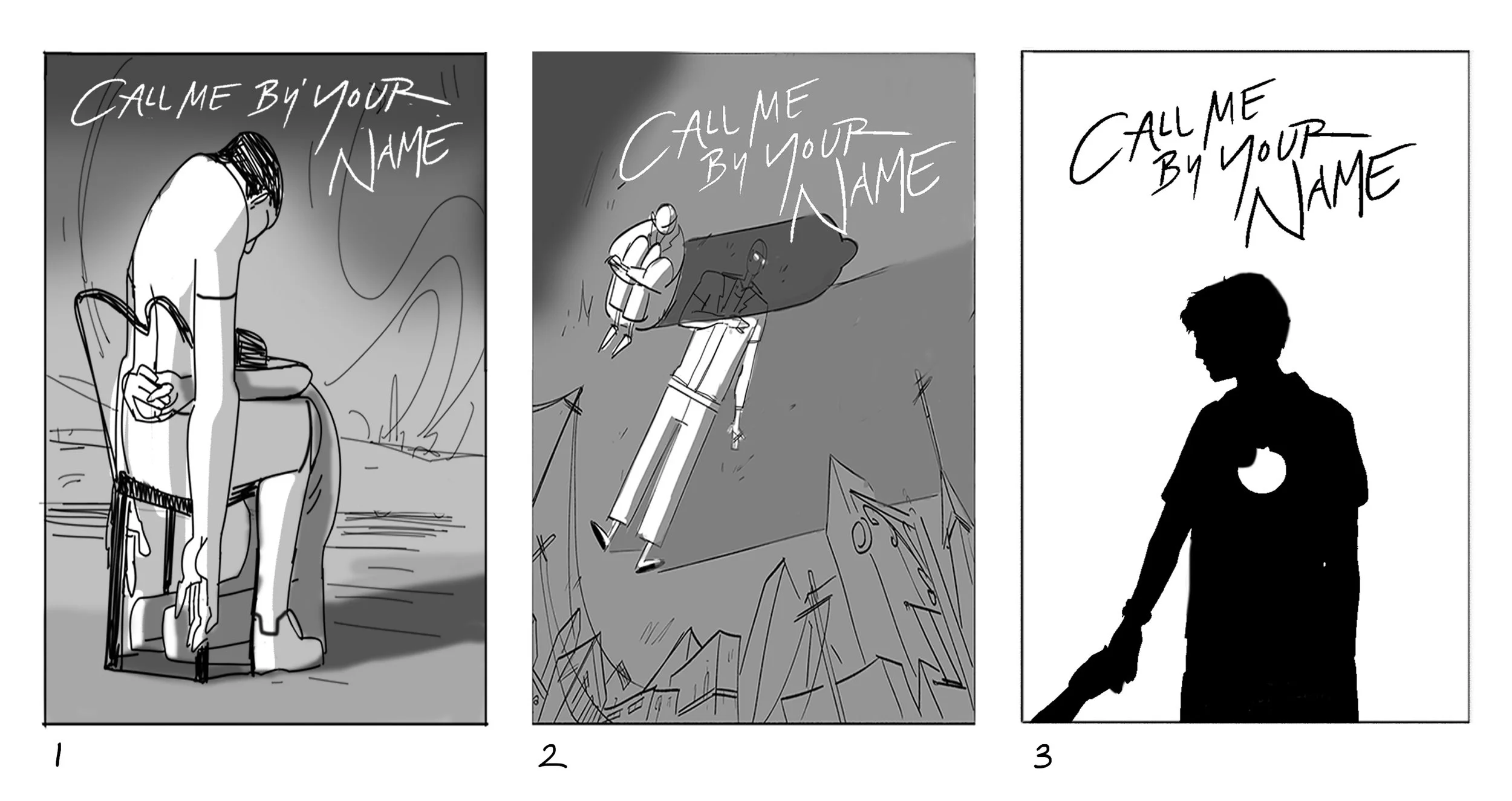Call Me By Your Name - For these sketches, I explored different forms of intimacy. I decided to build out Composition 3, due to the combination of physical intimacy, feelings of loneliness, and the peach symbol.